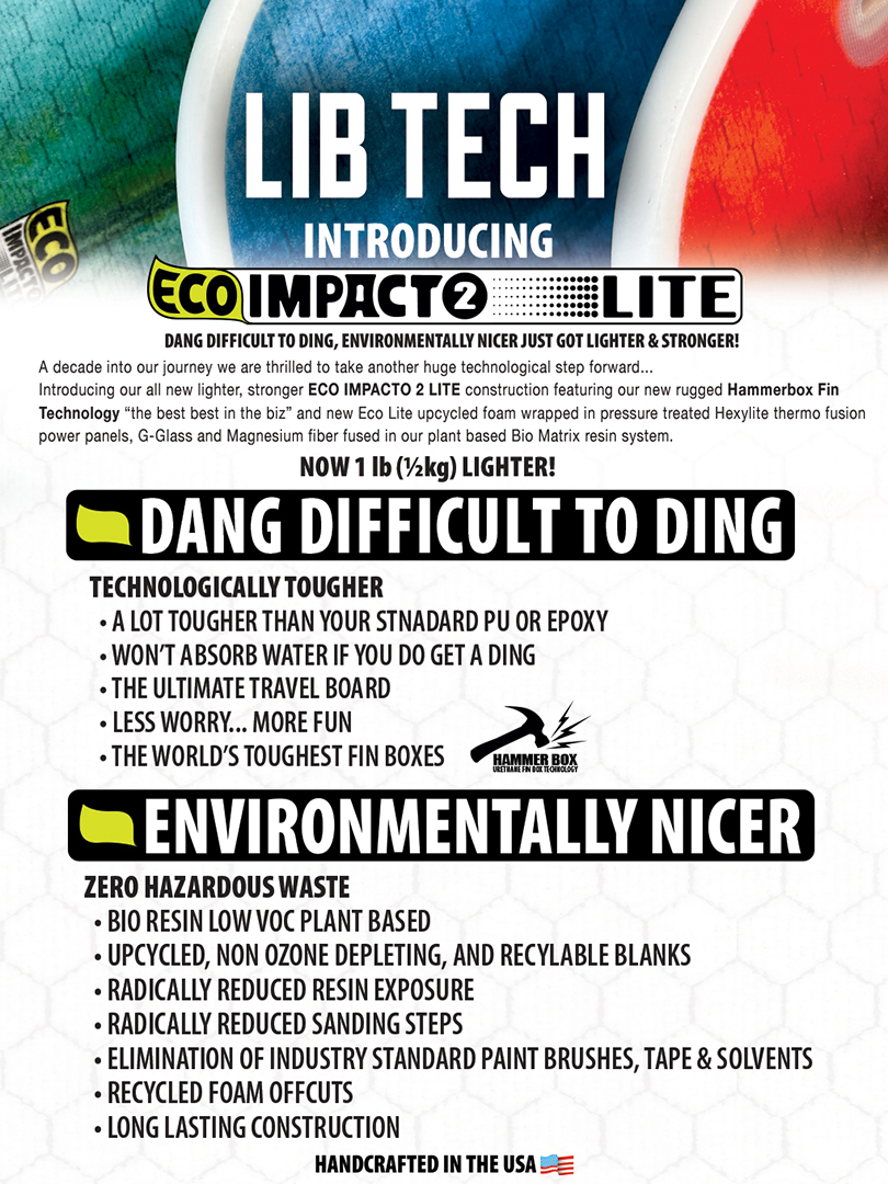 - TECHNOLOGICALLY TOUGHER - environMENTALLY NICER! - Lib Technologies is dedicated to hands on board building and riding. We have spent a lifetime surfing, shaping and working with alternative high performance environmentally friendly materials and constructions. Traditional surf construction has always felt too fragile and the building process is toxic and unhealthy for the planet and crafts people... we knew there had to be a better way.