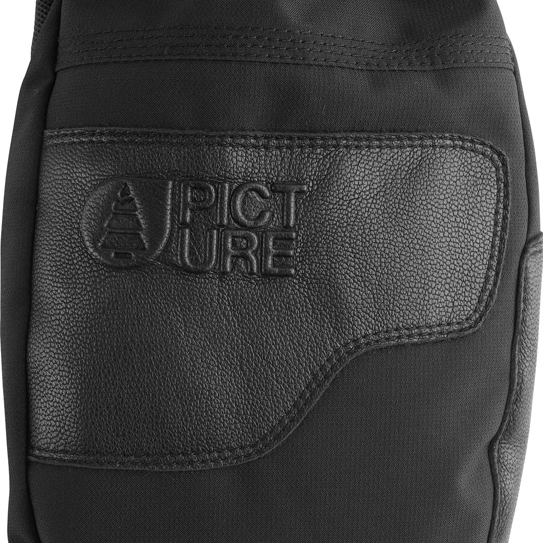 The rubber palms and black flock velvex thumb enhance grip and durability, allowing for precision control whether carving turns or catching air. Adjustable cuffs with a hook and loop system ensure a secure fit, and the Picture wrist leash adds a touch of style and functionality.