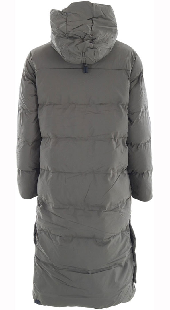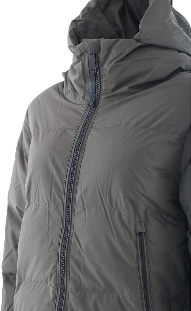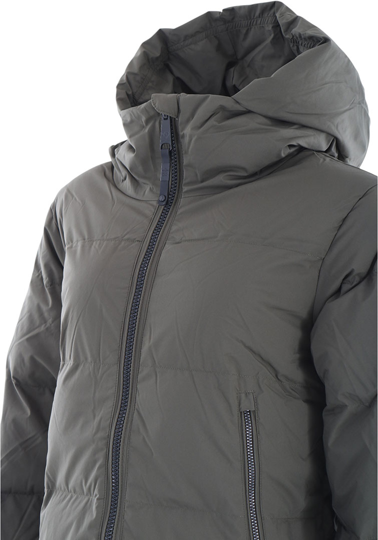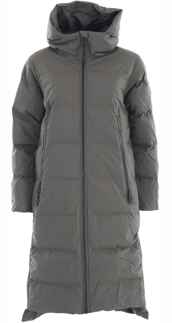 - A lengthy quilted coat with a hood, entirely vegan and well-suited for winter