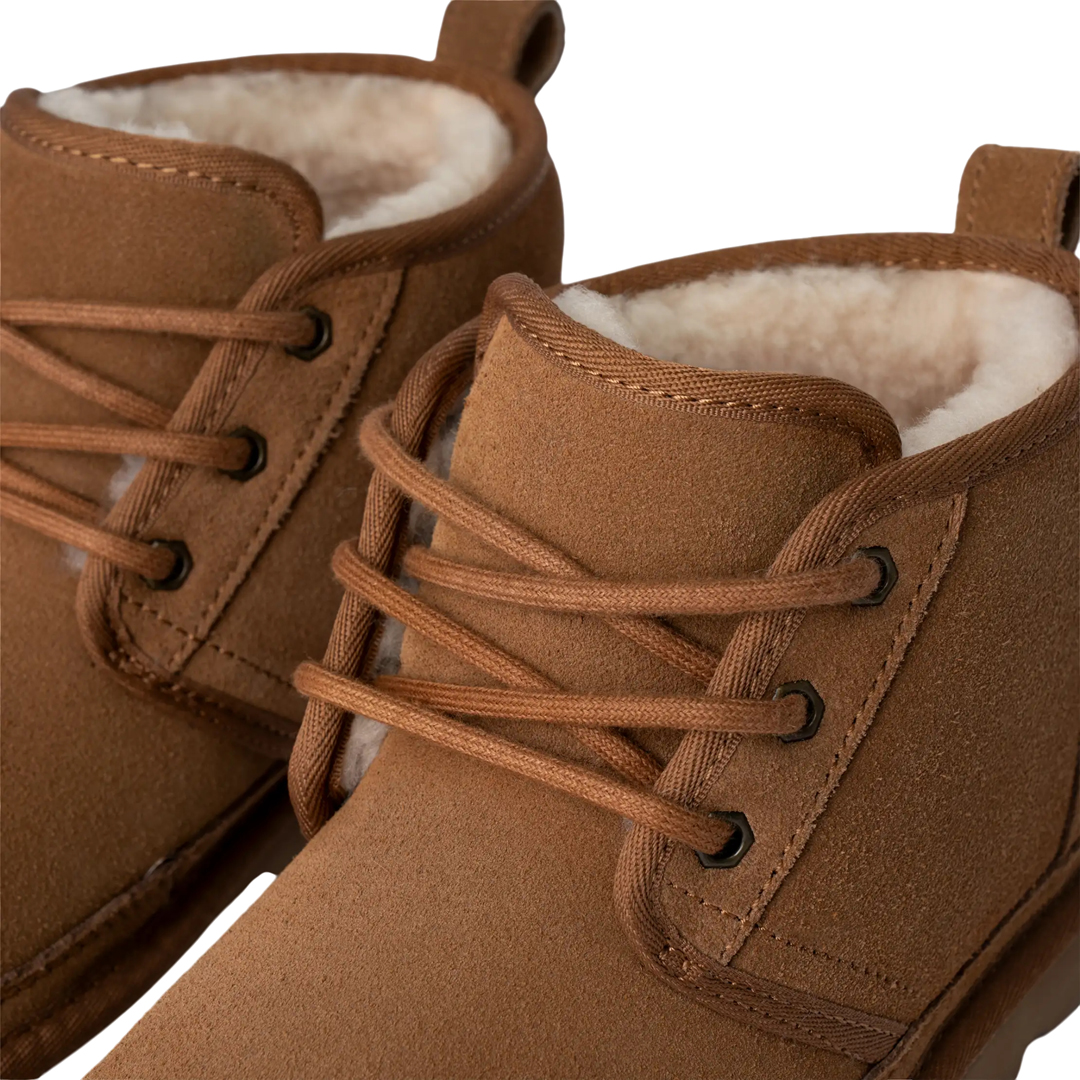 Combining premium materials and effortless style, our women's Neumel Boot is our iconic Heritage chukka. A timeless everyday laced boot made of rich suede, our women's chukka is lined in upcycled UGGplush wool and finished with a durable outsole for all-day cushioning, offering a signature slipper-like feel indoors or out. This suede chukka is available in a range of dark and light neutral colors including black and brown.