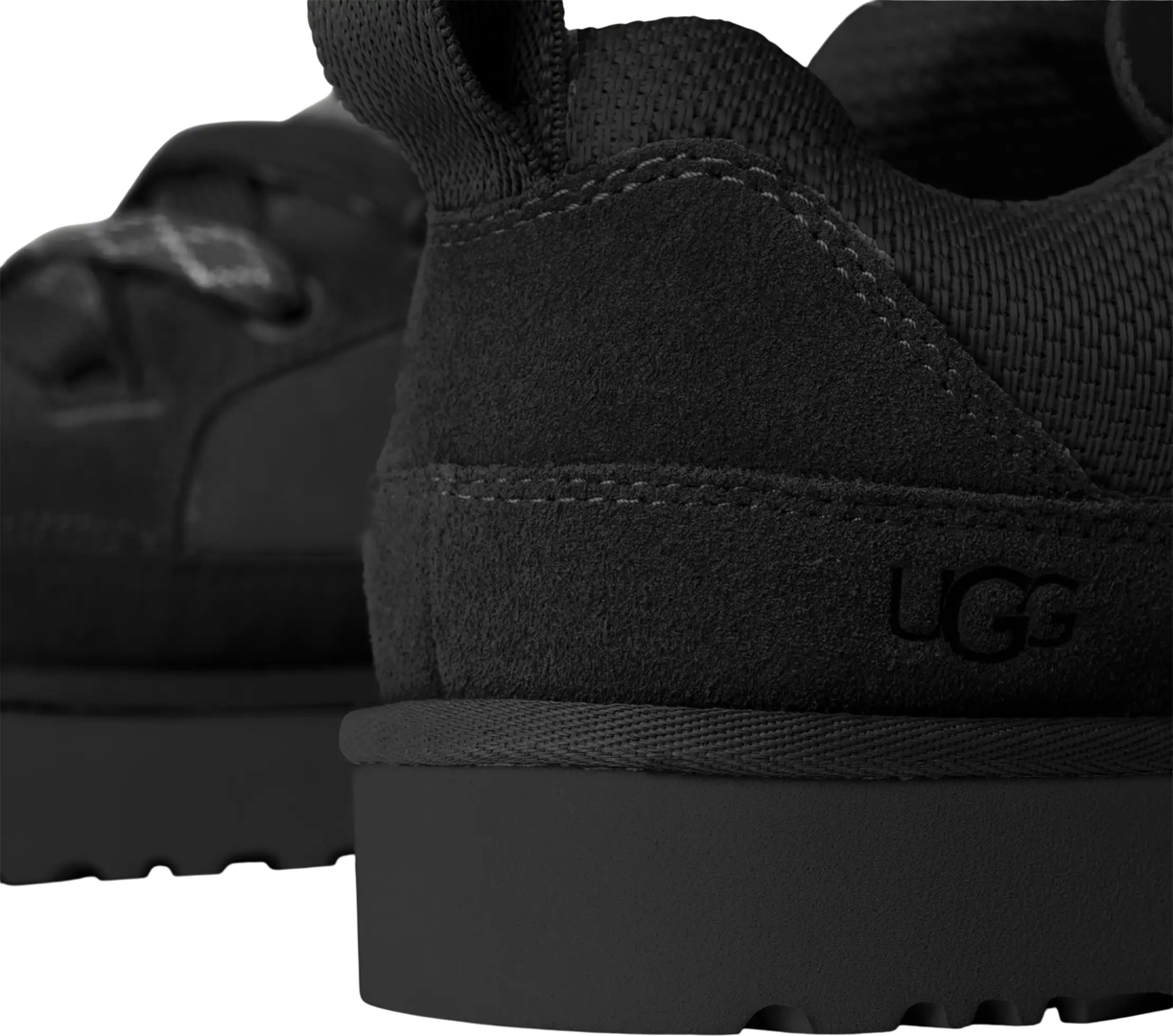 - Obermaterial aus Veloursleder und recyceltem ballistischem Canvas-Mesh Fersenriemen aus Webstoff, UGG® Logoaufnäher, übergroße, gepolsterte Lasche