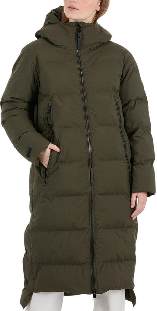 - Ein langer, veganer Steppmantel mit Kapuze, perfekt für die Wintersaison