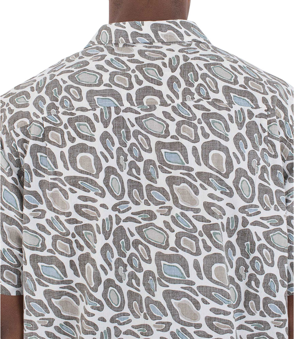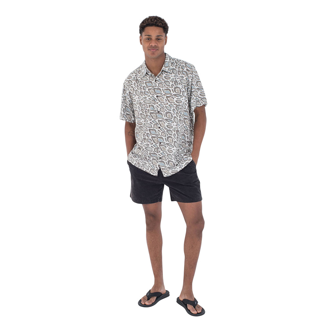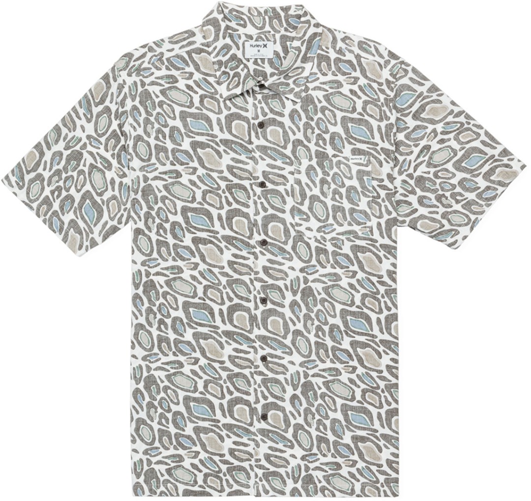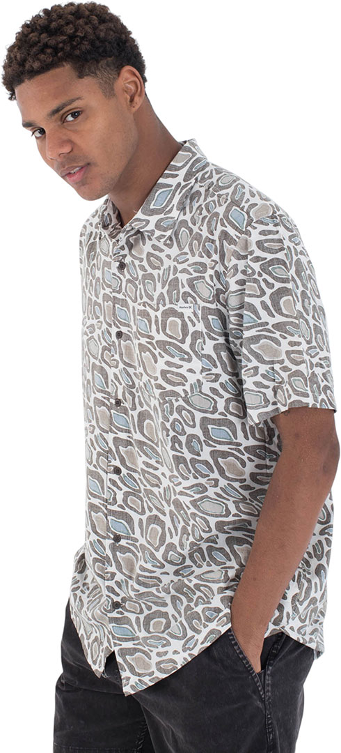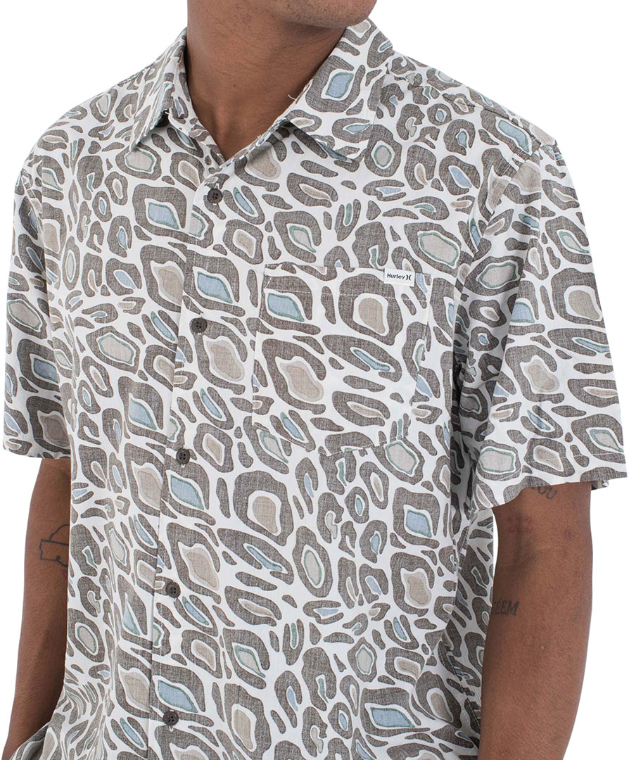 Das Hurley Rincon Kurzarmhemd für Herren bringt Naturdrucke auf die nächste Ebene. Es ist aus einer Baumwoll-Viskose-Mischung mit Knöpfen aus recycelter Kokosnuss und einem gerade geschnittenen Saum mit seitlichen Schlitzdetails gefertigt.