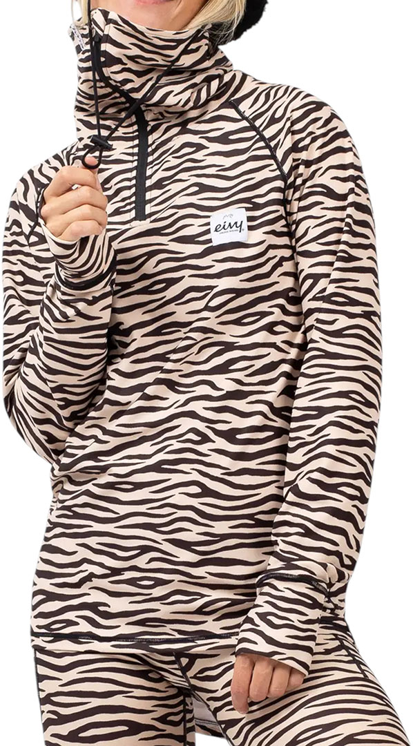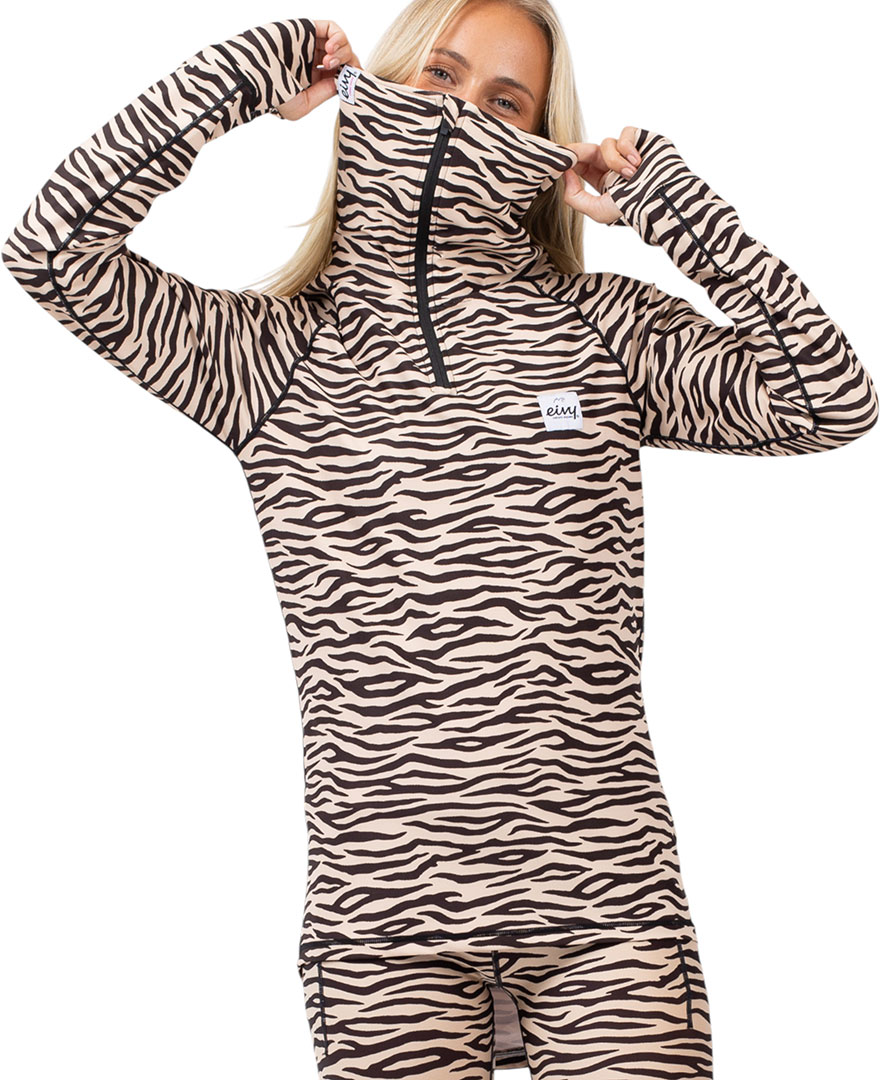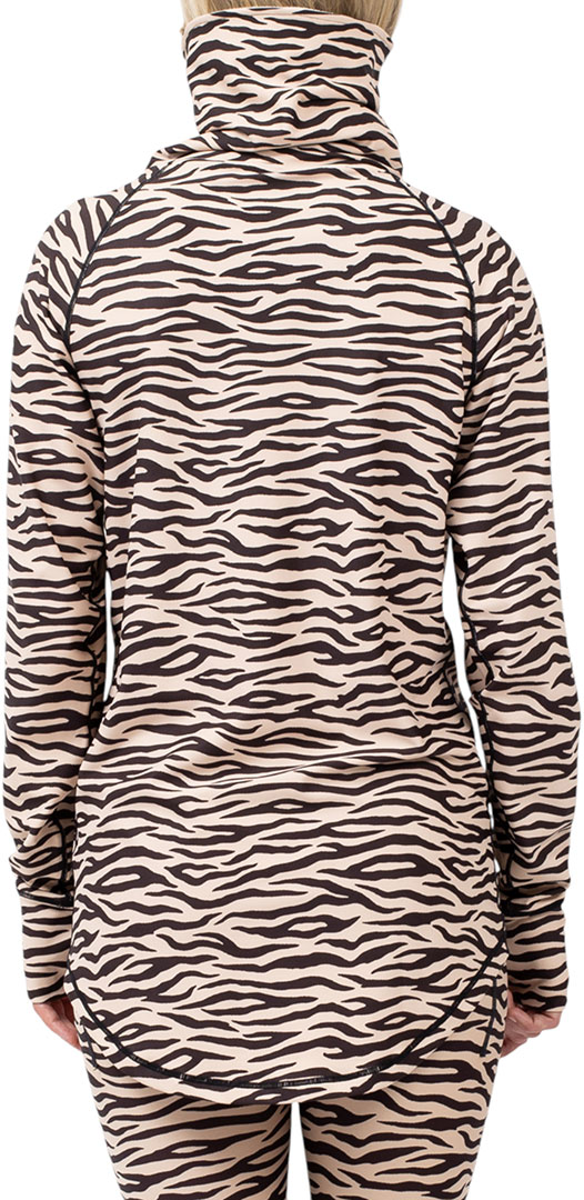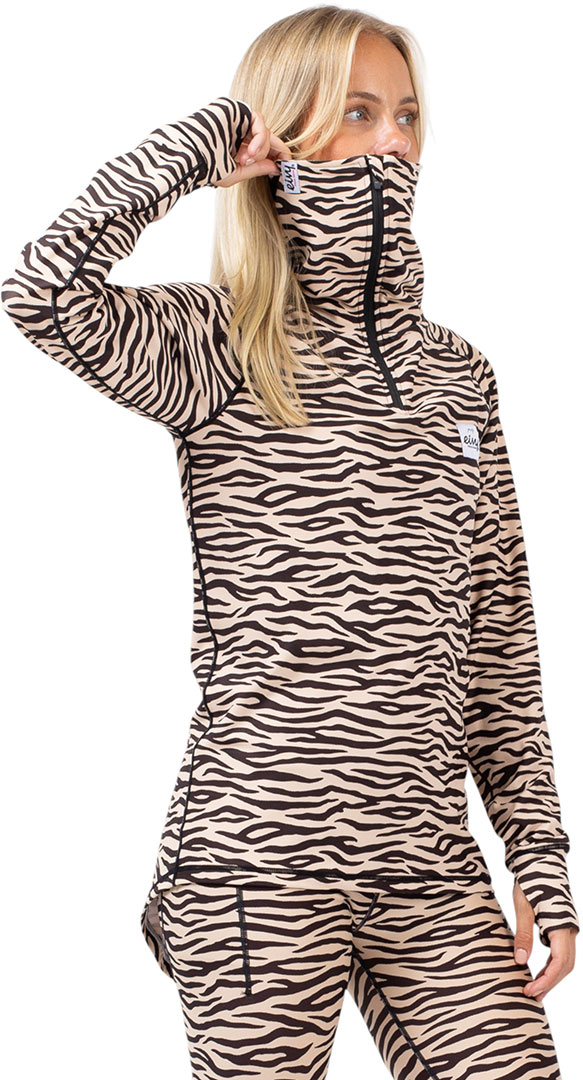 Langärmliges Funktionsshirt, im Zebramuster. Werde bereit für endlose Abenteuer und Eiskalte Wintertage auf dem Snowboard oder den Skiern, mit hilfe von dem integrierten vliesgefütterten Nackenwärmer mit Zipper und das Verlängerte Rückenende. Die Flatlock-Nähte verhindern unangenehme Reibung und die integrierte Daumenschlaufen sorgen dafür, dass Ihre Ärmel bei allen Abenteuern an Stelle bleiben. Mit dem langen YKK®-Reißverschluss können Sie selber entscheiden, wie viel wärme der Kragen halten soll.